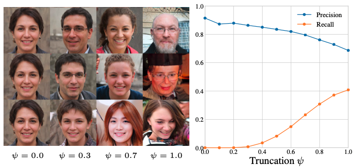 그럼 truncation을 많이 할 수록 diversity는 낮아지지만 fidelity가 높아지므로, precision은 높아지고 recall 은 낮아져야되겠습니다. 오른쪽 그래프를 보시면 그 결과를 확인 할 수 있고, 실제로 precision 과 recall 이 원했던 방향의 성능지표로 활욜 할 수 있음을 보여줍니다.