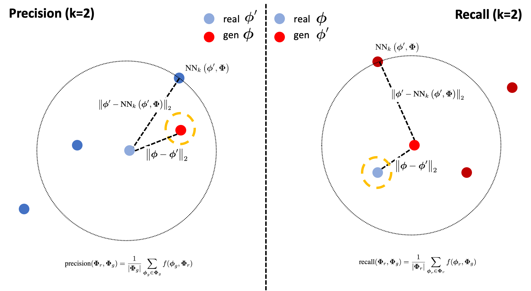 $\Phi$ 는 real 또는 fake 의 embedding vector(feature vector) 들의 set 이고(각각 $\Phi_r$,$\Phi_g$) $NN_k(\phi', \Phi) 는 $\phi'$ 에서 $k$ 번째로 가까운 feature vector 를 계산해줍니다.