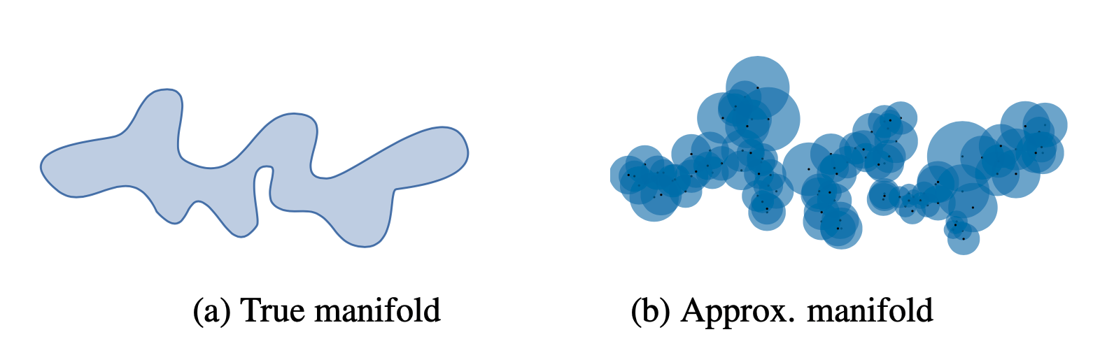 위의 그림을 보면 직관적으로 쉽게 알 수 있습니다. 각 sample 들을 기준으로 kNN ball 을 만들어 manifold를 근사하는 방식입니다.