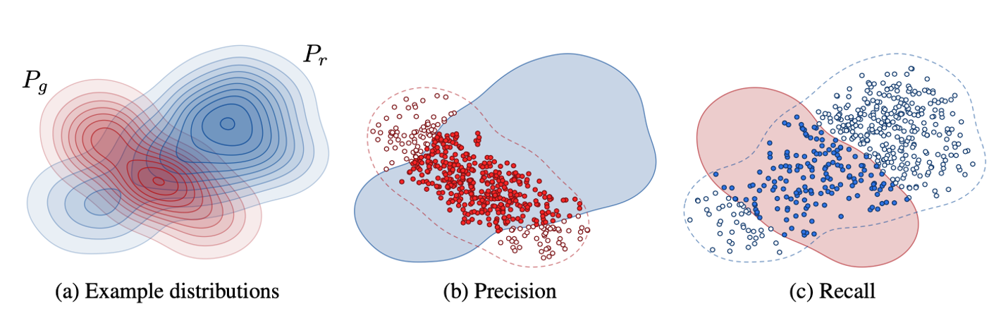 즉, $P_g$ 가 $P_r$ 을 얼마나 잘 커버 했냐 라고 생각한다면, real 분포의 넓은 부분을 커버 할 수록 다양한 sample 들 까지 생성할 수 있겠죠. 그래서 Recall 은 Diversity에 대한 지표입니다.